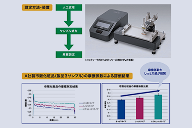 使用感評価は人による官能評価が用いられますが、個人差によって、結果にバラつきが生じることがあります。当社では、機器分析による化粧品使用感の定量的、安定的な評価に取り組んでおり、製品間における違いを検出し、「数値化・可視化」を提案いたします。