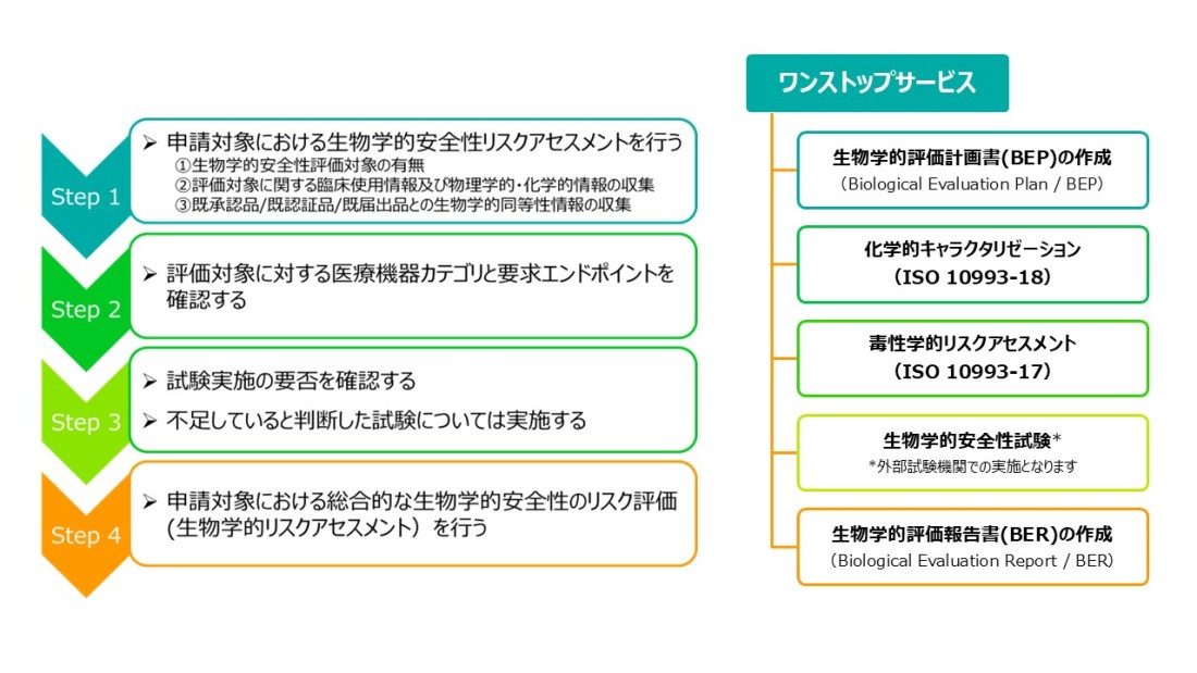 医療機器の生物学的安全性評価においては、当該機器の生体適合性や臨床使用における潜在的な生物学的リスク等を国際的なガイドラインであるISO 10993-1:2025にしたがって確認する必要があるとされており、国内通知*においても、下記のStep1~4にしたがった生物学的安全性評価の実施が求められています。