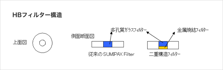 HBフィルター(ハイブリッド型)は、ガラスフィルターと金属焼結フィルターとを積層した二重構造により、微粒子の捕捉能力が格段に向上していますので、カラムの前に接続することによって、カラムの寿命を延ばします。特に、超高速LC用カラムの保護に有効です。