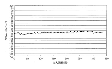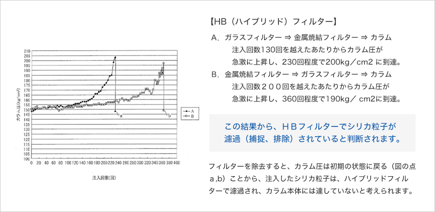 フィルターを装着したカラムにシリカ微粒子を注入し、カラム圧の変化を観察・比較しました。