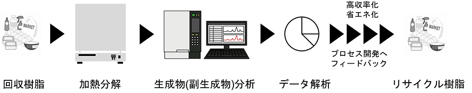 樹脂リサイクルで問題となる物性の低下などの課題を解決するため、ポリマーをモノマーに分解して再度製品にする研究開発が取り組まれています。分解プロセスでは、分解に必要なエネルギーの低減、分解生成モノマーの高収率化が求められています。