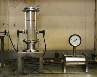 密閉容器内の粉じん-空気混合物が爆発すると、容器内の圧力が上昇します。爆発圧力はある最適粉じん濃度で最大値を示し、この最大値をその粉じん-空気混合物の最大爆発圧力といいます。また、爆発圧力の時間に対する変化率の最大値を最大圧力上昇速度といいます。爆発圧力は粉じんの種類、粒子径、濃度の他に、容器形状や粉じんの流動状態等の影響を受けるため、爆発指数(Kmax)を求めるためには、20L以上の爆発試験装置による試験が必要とされていることから、弊社では20L球形爆発容器を用いて測定しております。JISでは、63μm程度と規定されていますが、粒子径はお客さまのご希望に応じて対応しています。