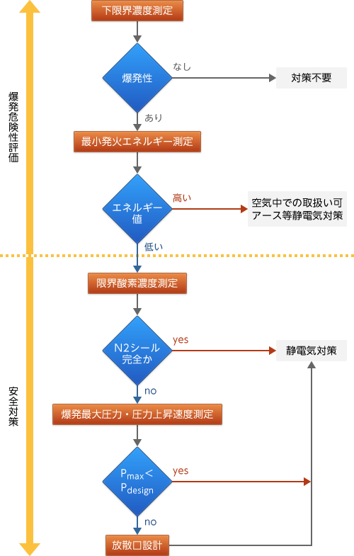 可燃性粉じんはある比率で空気中に浮遊すると、何らかの着火源の存在により、爆発を起こすことがあります。このような粉じんに対して「爆発のしやすさ」と「爆発の激しさ」の観点から、以下の試験が行われます。しかし、粉じん爆発性は粉じんの種類、粒径に顕著に依存するばかりでなく、ガス爆発同様に試験装置、方法によっても結果が異なる場合がありますので、データの取り扱いには注意が必要です。下限界濃度測定、および爆発圧力測定が2002年にJIS化されました。弊社では、それに伴い2003年6月より下限界濃度、爆発圧力・圧力上昇速度測定・爆発指数(Kmax)につきましてはJIS規格に準じた試験法を採用しております。