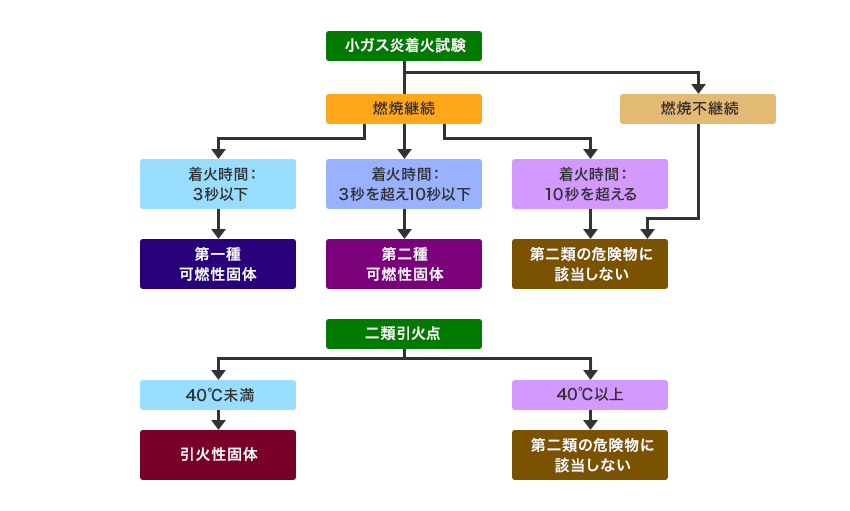 | 第二類 | 可燃性固体 | 火炎により着火しやすい固体又は比較的低温(40℃未満)で引火し易い固体 |