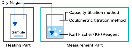測定容器内に採取した試料を加熱し、発生した水分を乾燥窒素ガスで測定セルに送り捕集した水分を電量滴定法または容量滴定法で定量します。