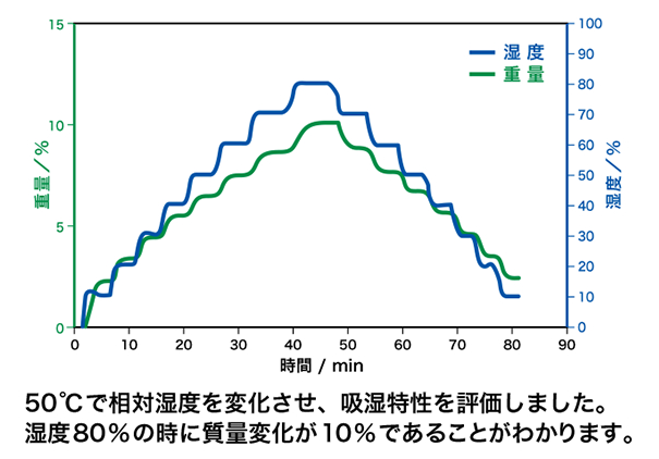 密閉空間の湿度変化による質量変化を連続的にモニターすることで吸水速度や吸水量などの水分吸脱着特性を評価できます。