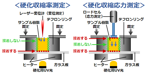 サンプル容器(ガラス板及びテフロンリング)へ硬化樹脂を入れ、硬化条件(UV照射、加熱)に基づいて硬化させます。その際、硬化に伴う体積変化(厚みの変化)をレーザー変位計で連続的に計測し、硬化収縮率を求めます。また、検出器をレーザー変位計からロードセルへ変更することで、硬化に伴い発生する応力を計測します。