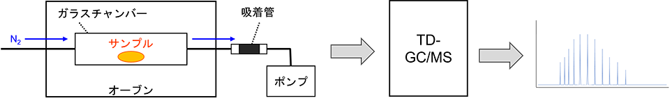 試料を加熱し吸着菅に捕集し、熱脱着-ガスクロマトグラフ質量分析計法(TD-GC/MS)で測定します。