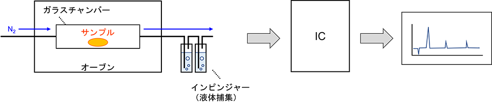 試料を加熱しインピンジャーに捕集し、イオンクロマトグラフ法(IC)で測定します。