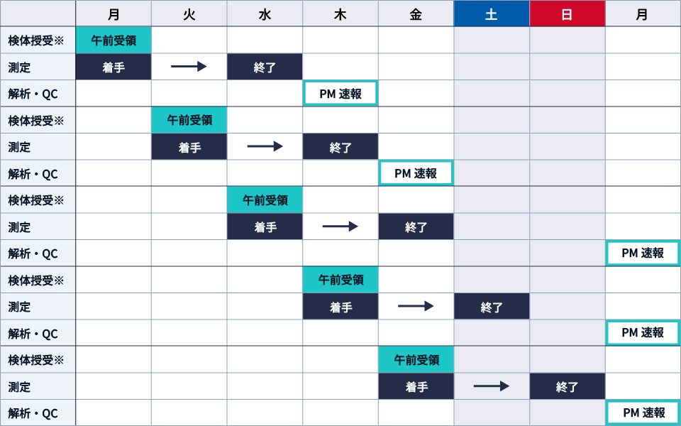 - ※1 「検体受領および試験着手」:月曜日~金曜日(祝日および定休日を除く)