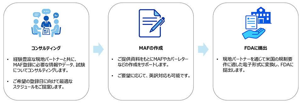 米国FDAへのMAF(Master File for Devices/メディカルデバイスマスターファイル)登録に関するあらゆる手続きを、経験豊富な専門家がワンストップでサポートします。