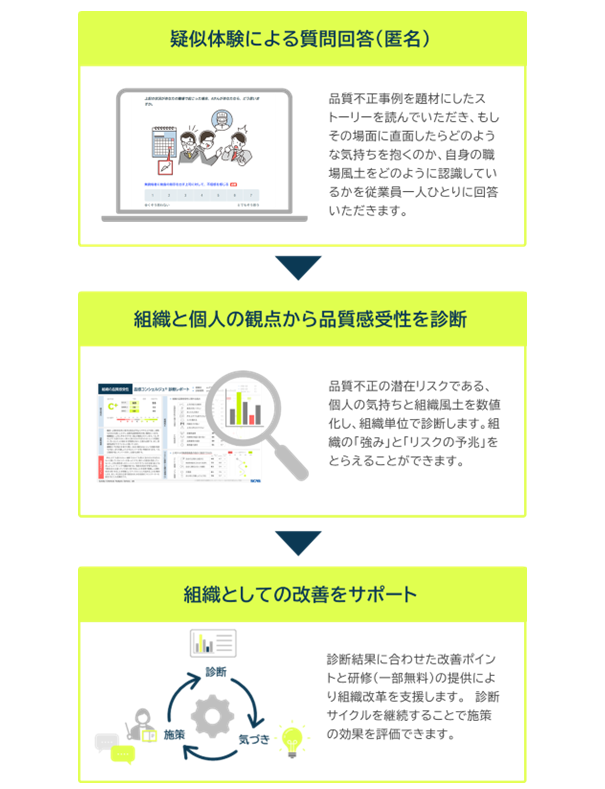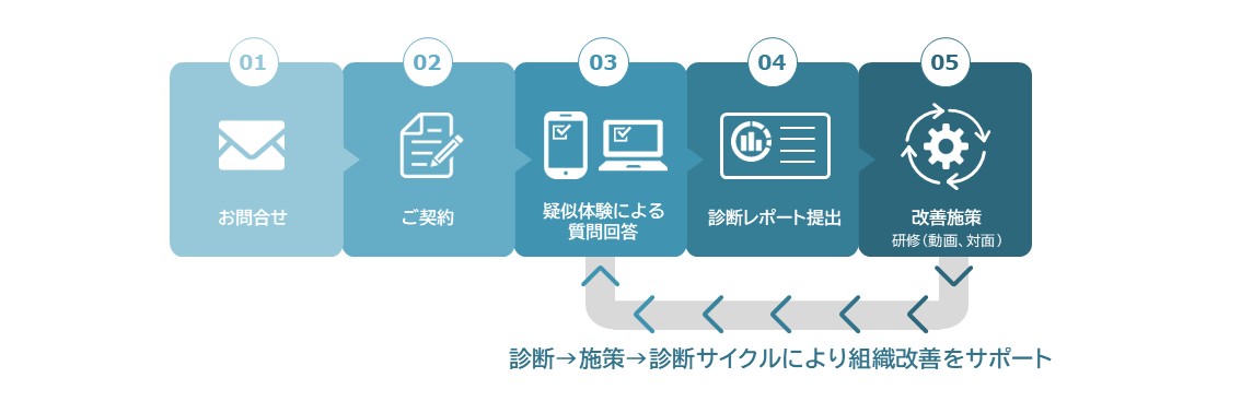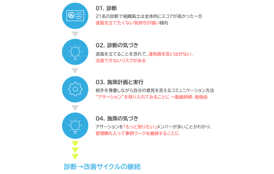 疑似体験による質問回答→診断→改善施策のサイクルを継続することで、健やかで感受性の高い組織をめざします。