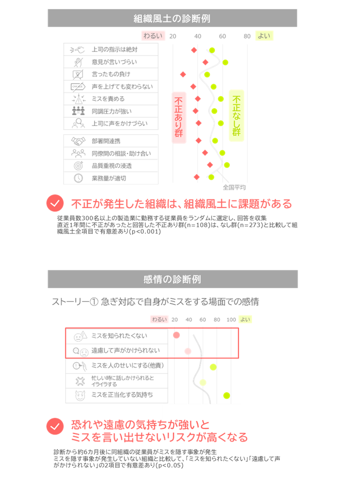 実際に不正があった組織は、不正がなかった組織よりも組織風土と感情の診断スコアが有意に低い傾向があります。組織単位で診断することによって、みえていなかった違和感をキャッチし、どの職場・どの層に重点的な支援や働きかけが必要なのかが明確になります。